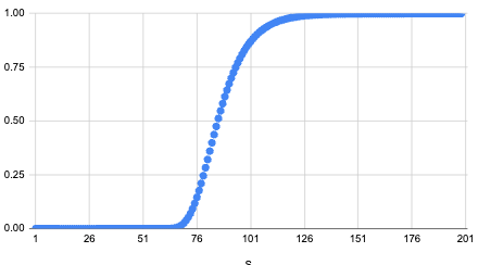Calculating the exact probability that our approach works is more difficult than the coin toss example, but follows the same principle of failure becoming exponentially more unlikely across several trials. We can use some assumptions (notably the central limit theorem) to calculate a rough approximation of the probability of success. Here is a graph of the probability of passing the problem given a certain value of . Note that the probability of success remains is largely the same across different counts of distinct colors along the path.